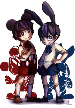 The Bunny is his older half-brother, Oswald the Lucky Rabbit. He was the cartoon star before Mickey, but Disney lost the rights to him to Universal. Later, Disney created a similar looking character who is now the hero and cartoon star we know today, Mickey Mouse. In 2006, Disney finally got the rights back for Oswald and now he's slowly progressing into the limelight. His greatest come-back so far is his appearance in the Epic Mickey video game. If you wanna know more, here's a link [link]