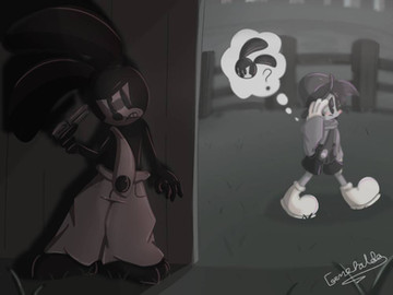 My fake screenshot of Mickey and Oswald's first encounter with the shadow. Of course, Mickey's not in this because originally it was a perspective test and I wanted to add the shadow as well. I didn't know how to add Mickey in this where he's not blocking the shadow, so he's just off screen for this one. Next time he'll be in it, I promise.Thanks to this tutorial [link] I now know how to make a fake anime screenshot that you watch on Youtube.