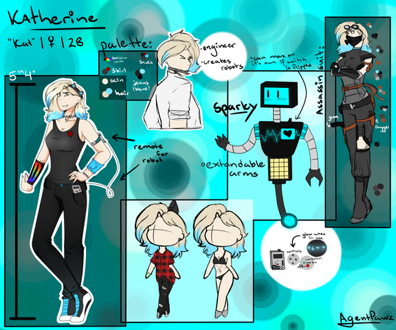 So this is Katen, she's kind of a scientist. Kind of because she's not too great at it, so instead she cooks, but sometimes she tries to mix her two interests together and they usually don't turn out too well. Lorre will often go to her for requests that will "backfire in her interests". Katen also has a special suit that acts as protection against various things and is used when she is building robots (which "usually" don't backfire thankfully), dealing with a kitchen that's on fire, and for handling and juicing those that might have eaten something funny which may or may not have been crafted by herself. She's good friends Lorre and Zoe, however Zoe will usually try to avoid the cooking.If there's any info about there character that I didn't put here and your curious about feel free to ask bout it