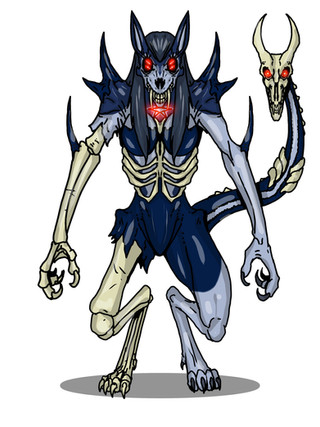 Hell creatures are rather a very rare race of species found in the hell world. They all share black blood seen on their backs, they are also covered in skeletal type body fragments. They are like bacteria, they don't breed but multiply only from their black blood. It's like evolution by cloning.They can also be described as reptilian types.