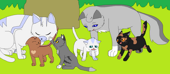 Frecklepelt and Scorchblaze have had kits So welcome the new kits of Pineclan.I love this couple :3 they had a real rocky start but now have a beautiful family of their own. They have four kits (from left to right); Ripplekit, Pricklekit, Kestrelkit & Gorsekit.