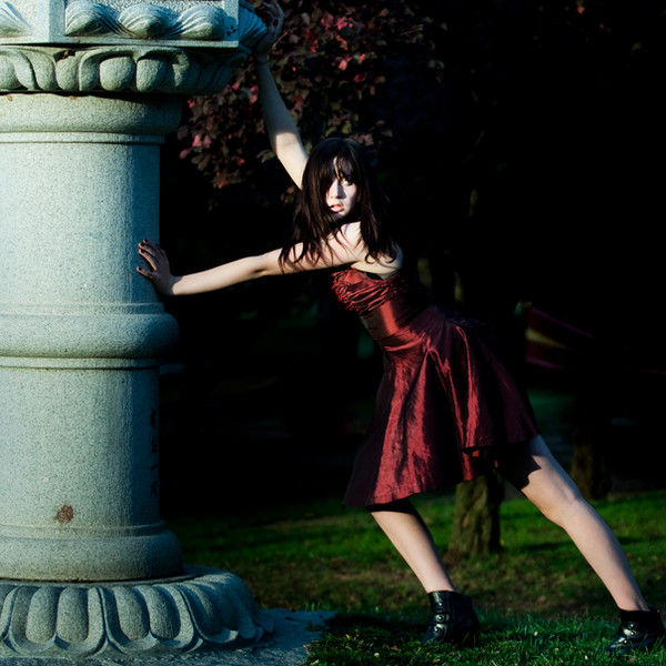 The vivid blacks and reds are breathtaking, symbiotic and underscored by the white ground. The comparison of the shiny boots, hair and the β what looks like velvet β dress help the shot pulse variously with its rhythm of absorption and reflection of light, texture and smoothness. The physicality and athleticism of the pose repeats the visual tension of the boot that not only points upwards but seems to be pulling everything else in the shot with it as though it were on its way through the top of the frame. The line created by the taut strand of dress fabric from the subjectβs knee to her right hand abets this ascension and tension.