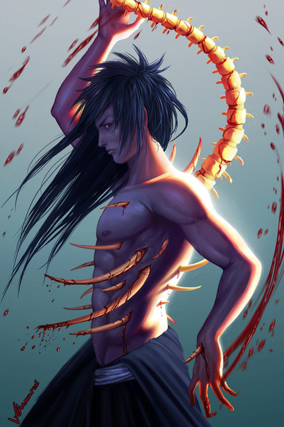the anatomy, the colours, his face and clothing, the movement in this picture is just wonderful. He really is a poor, sad, empty boy and I just hope he finds peace. Kishimoto has a way with his readers most of the time causing them to feel so strongly about his characters.