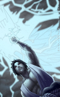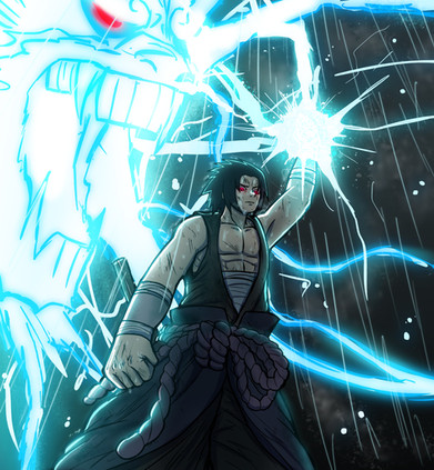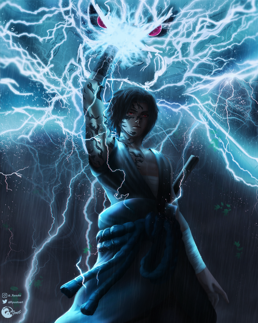 I like the monochromatic nature of this piece. Sasuke's light skin helps catch the viewer's eye and it compliments the Kirin that's above him.
