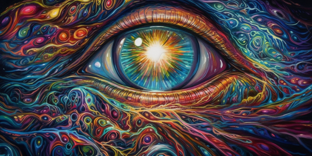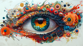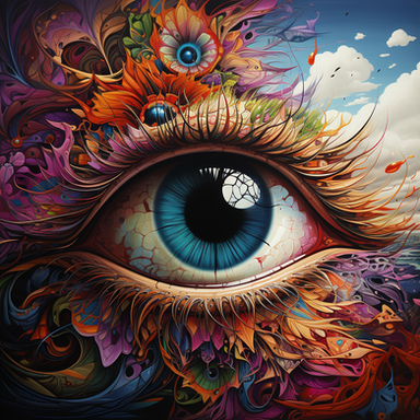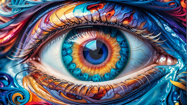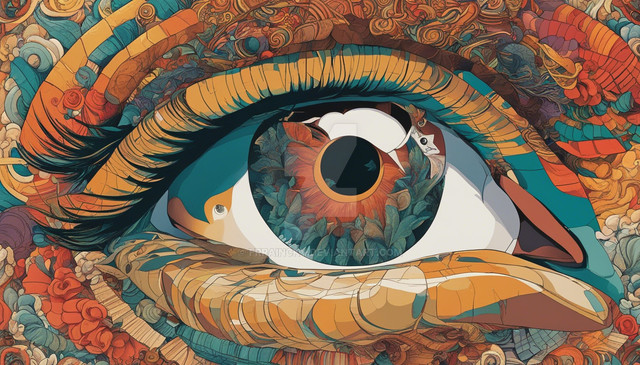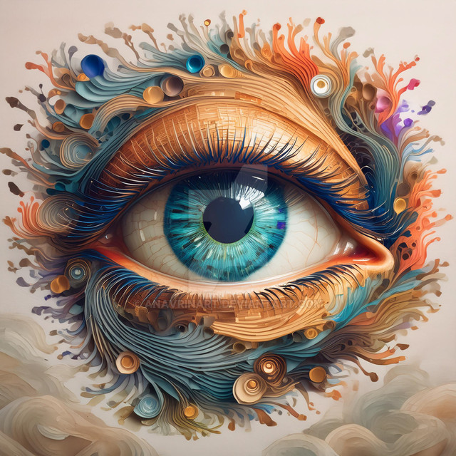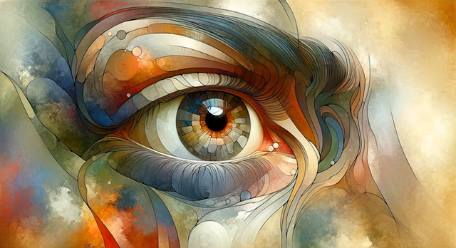 This image captures the essence of contemporary art, blending realistic elements with abstraction for a visually stimulating effect. The highly detailed central eye is surrounded by a weave of geometric shapes, curved lines, and an assortment of warm colors that draw the eye and invite personal interpretation. Suitable for online art galleries, design blogs, and art education websites, this image is an excellent addition to attract visitors in search of unique and inspiring visual content.