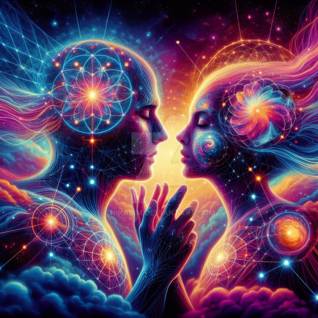 Explore the harmony between the organic and the synthetic with 'Abstract Canon' This captivating illustration features a female humanoid and an android in an embrace that symbolizes the unity of human emotion and mechanical precision. Immersed in a colorful universe, this scene is an ode to the beauty of integration between different worlds. It is a significant addition to any collection that celebrates digital art and science fiction, offering a visually enchanting interpretation that captivates and invites reflection