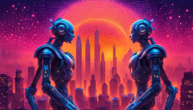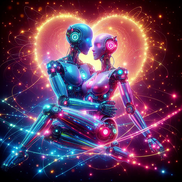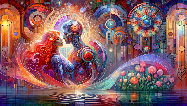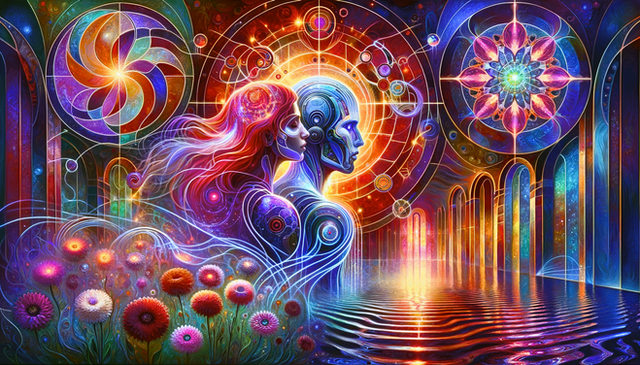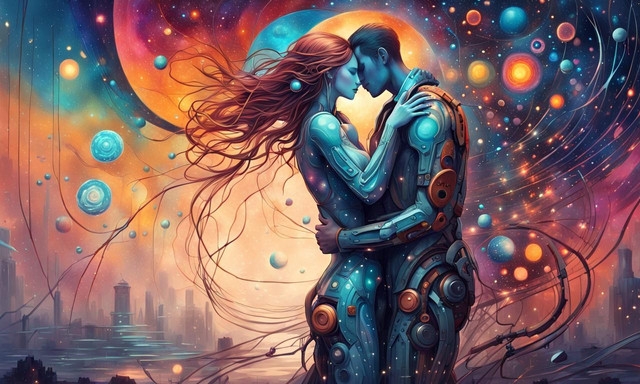Explore the harmony between the organic and the synthetic with 'Abstract Canon' This captivating illustration features a female humanoid and an android in an embrace that symbolizes the unity of human emotion and mechanical precision. Immersed in a colorful universe, this scene is an ode to the beauty of integration between different worlds. It is a significant addition to any collection that celebrates digital art and science fiction, offering a visually enchanting interpretation that captivates and invites reflection
