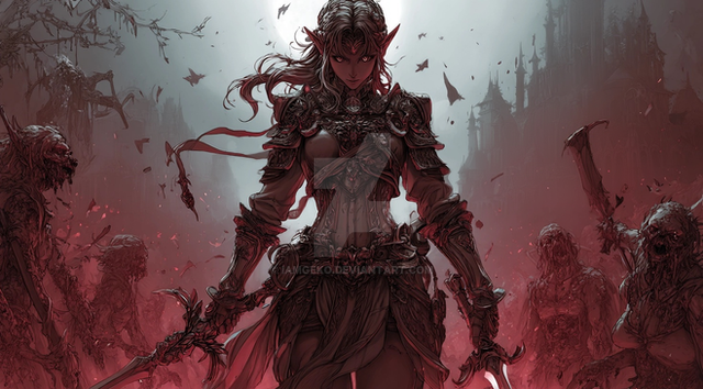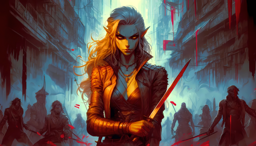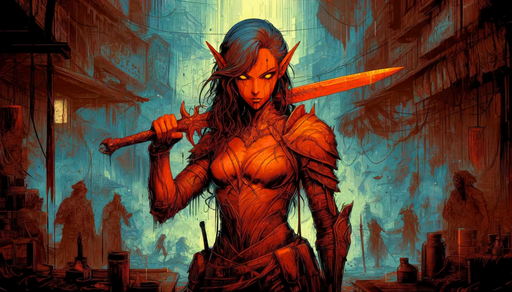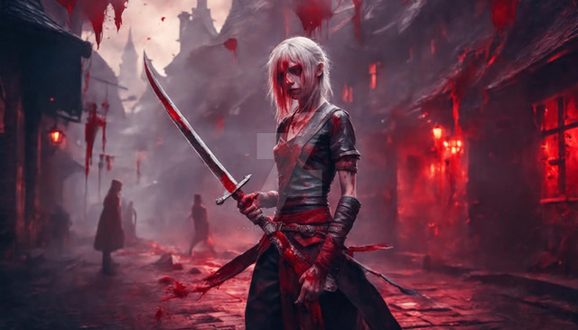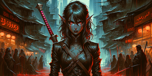#assassin #bleeding #cyberpunk #dark #dystopia #elf #enigma #esoteric #eyes #fantasy #figures #futuristic #gothic #grim #high #influence #landscape #red #shadowy #streets #style #surreal #themes #warrior #animemangagirl #aiartcommunity #dalle3_ai_art