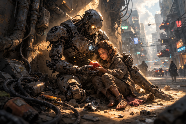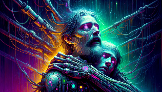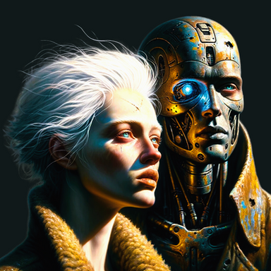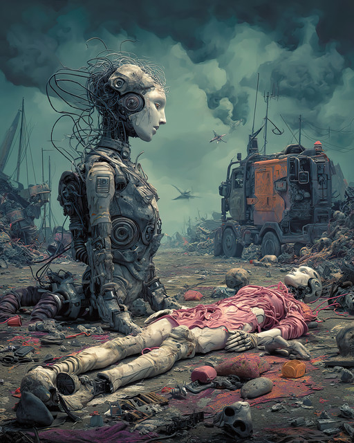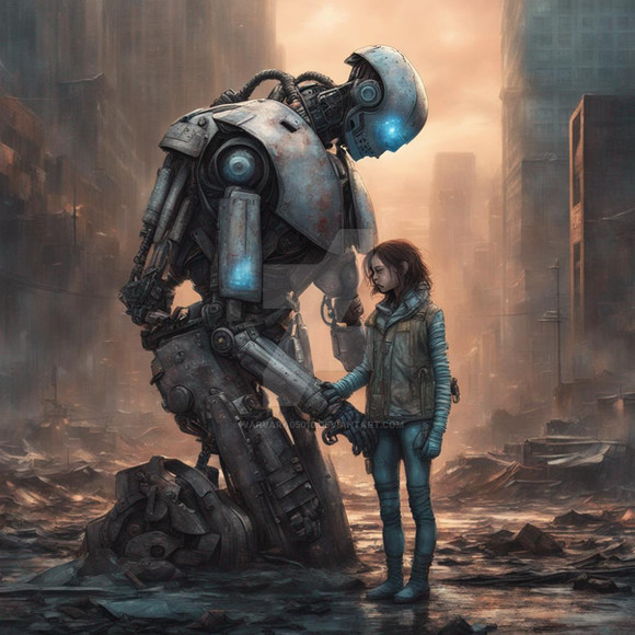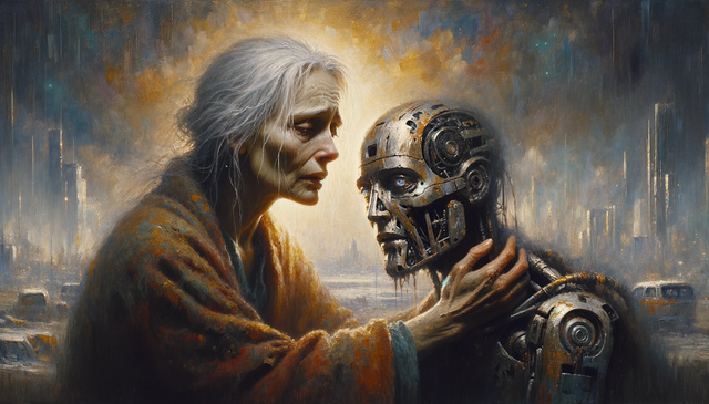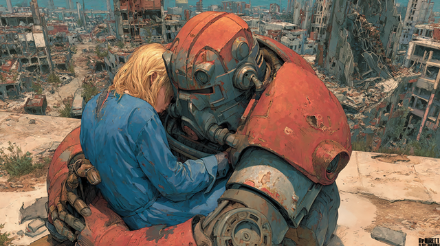 #scifiartwork #dystopianlove #cyberpunklove #cyborghumanconnection #robothumanembrace #restindisgrace #postapocalypticart