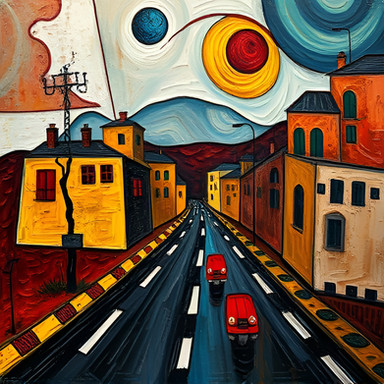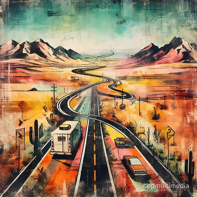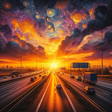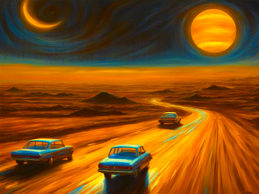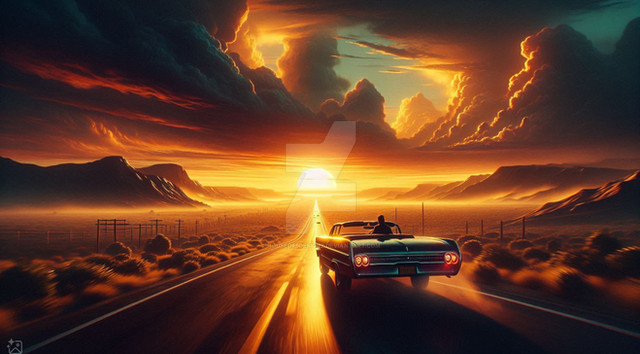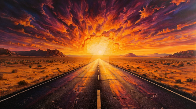 #surreal #adventure #cinematic #crossroads #desert #dreamscape #endlessjourney #epic #fadinglight #goldenhour #horizon #infinity #landscape #mystical #painting #roadtrip #sunset #truck #visualart #lostroads