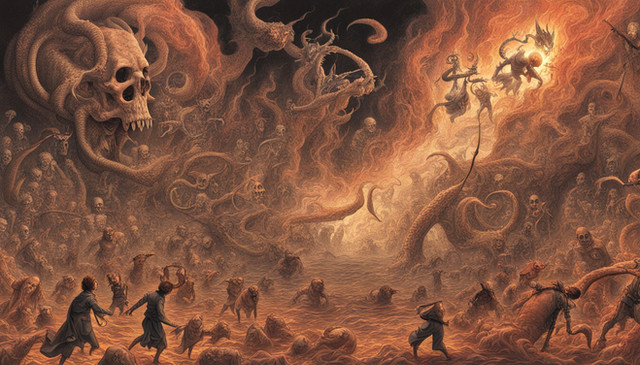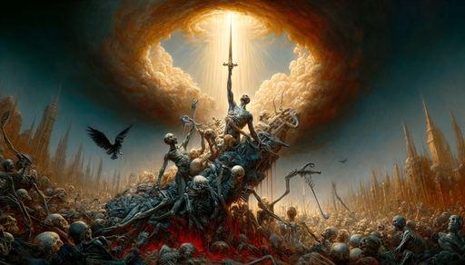#cosmichorror #darkfantasy #darksurrealism #eternalstruggle #fantasyartwork #gothichorror #horrorfantasy #radiantabyss #apocalypticart #skeletonwarriors #heavenlywar #apocalypticbattle #sacredchaos #cyberpunkfantasy #divinebattle #sacredritual #highfantasyart #hrgigerinfluence #surrealvisions #zdzislawbeksinskiinspired #hellishvisions #etherealwarriors #surrealapocalypse #esotericthemes #sunlitdestruction #infernalsacrifice #mythicalapocalypse #divinecarnage #sunlitdoom #skeletonempire
