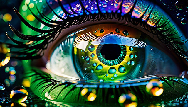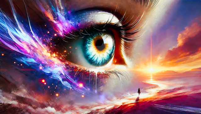 Dive into the depths of 'Visionary Horizons,' an evocative digital piece that captures the essence of surrealism and emotional expression. This piece features a strikingly detailed eye, complete with blue feathered eyelashes, gazing upon a reflective path that leads to a figure in contemplation amidst a dance of clouds. The eye's colorful tears add a poignant touch to the scene, suggesting a narrative of beauty and introspection. This image is a must-have for any digital art collection, appealing to those who appreciate the fusion of reality and imagination in visual form.