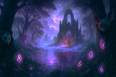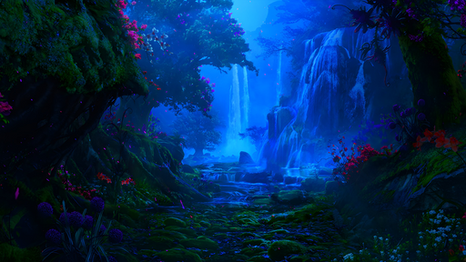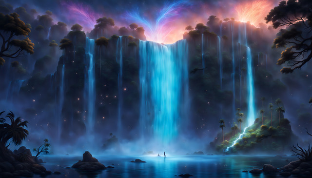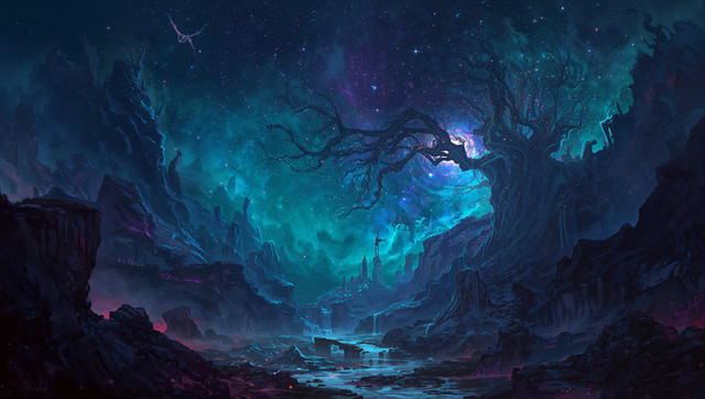 #forest #digitalpainting #bioluminescence #canyon #cloak #dreamscape #ethereal #fantasy #fireflies #footbridge #glade #landscape #mattepainting #mist #nebula #nightscape #river #starlight #wanderer #waterfalls