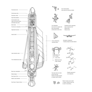 These vehicles also have a extendable hull that adds nearly 40% more volume (necessary for crew and supplies) once assembled and deployed. Six crewman operate the vehicle. The nuclear powered FEL laser sail is retractable (for stealth maximization) and provides a 1.5mw laser beam suitable for use against enenmy armore as well as incoming missiles. A single beam can be fired at full power or it can be pulsed to fire 10x per second with less power per beam.