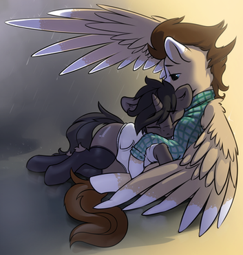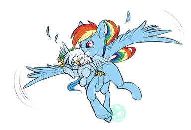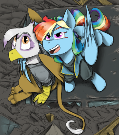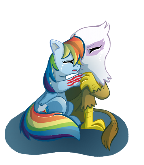 The words hit her all at once. Gilda gasped as though she'd been punched in the stomach. Her claws reached, grasped, squeezed, as if Dash would disappear if she let go. It wasn't long until she felt wetness on her cheeks. Trembling, she didn't resist it - couldn't resist it. And so she sobbed, in the hooves of her best friend of forever, for everything that had happened since they'd last held each other - all the fear, the doubts, the anger, the pain of long years of suffering. Dash was back.