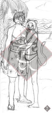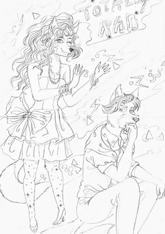 A quickie sketch created by in response to a silly little drabble I posted a few years back. Features from left to right, Leeza, her cousin Lance, Rufus in one his girlfriend's old dancing outfits, and Terinu, who's checking out Rufus' tail section.Basically Lance just lost a bet, and will be paying for everyone's drinks tonight.