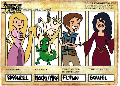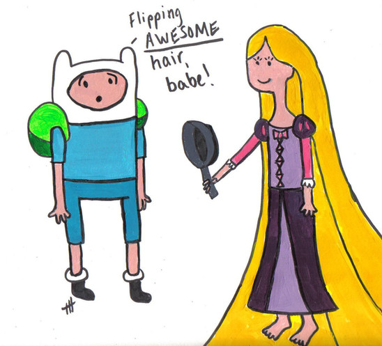 A drawing of Finn, Jake and Marceline as characters from the Walt Disney Animation Studios film "Tangled."This one still makes me chuckle.
