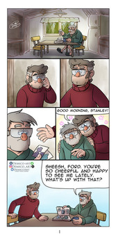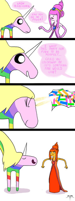 A request to draw BMO observing Finn and Marceline outside, and fantasizing about being a human and joining them. This is another drawing that featured a design for a humanized BMO created by a 4chan user named "EleventySeven" (if I'm not mistaken there). Though the AT fanbase knows very well that BMO is a boy, this particular human adaption was depicted as a girl, and 4chan just ran with it.This particular comic was pretty rushed, so the quality is comparatively awful.