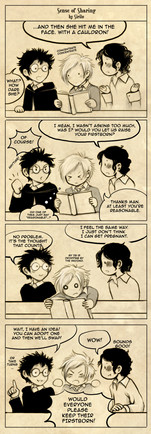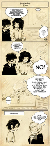 Oh, gosh, the way you draw them is too cute. Sirius's face in the panel just before Lily beats the hell out of him is utterly adorable. And panel 3, where they're looking at each other... aaaaw it is really too sweet. X3
