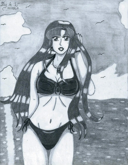 ^__^ oh yeah... pretty picture. i like her face and the background looks awesome... ! i love the way you colored her bathing suit. it's a cool design. *can't get over the coolness that is your background because the way it was colored looks so cool*