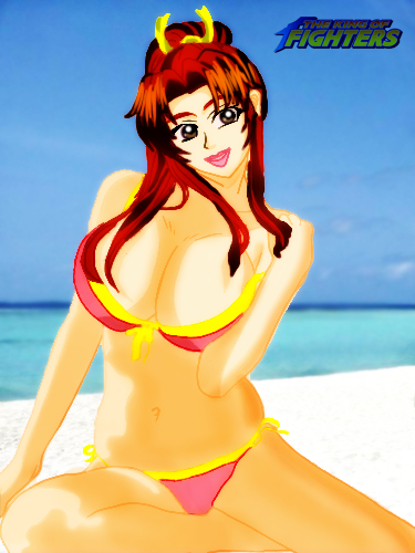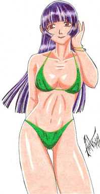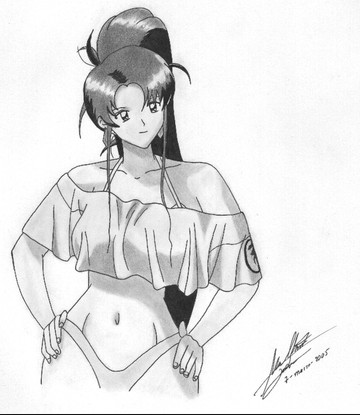 while i agree that the forehead is too large, you drew the hair and body extremely well! i also like the earrings and color of the bikini. the anatomy is accurate to her character and very sexy i might add. all in all, this picture is very impressive, as are all of your works. i wish i could draw as well as you could.