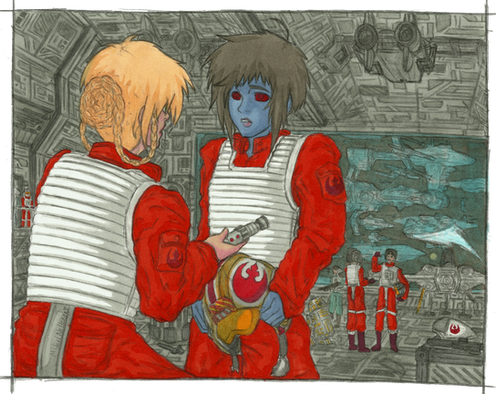 This was fun to do, it actually was just meant to be to show Quinn's personalized pilot helmet, however it turned into something a whole lot more! XD I enjoyed drawing all the background art, which is pretty funny because I generally hate working on backgrounds, I think it's all the ships and people that made it fun, I really enjoy drawing those, it's buildings and such that I hate. Heheh, I really like the little kid with the hat in the bottom right corner, maybe I'll use her again in the future, perhaps years later during the New Republic time period, who knows, I don't even know what race she is, I just made up a design... XD