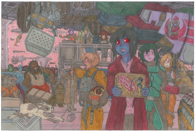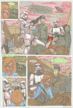 The bottom panel recalls one of Isabelle's last aid missions before fully transitioning into a dissident cell, she's accompanied by Chase, who was a fellow Alderaanian and Isabelle's second in command at the time, Quinn's tribute is just as much for Chase as it is for Isabelle. In the background members of Isabelle's organisation (including new members at the time, Juniqua Esteen, and Zomori) distribute aid to displaced refugees, survivors of a massacre who are grateful for the food and clothes Izzy's group are providing. Isabelle herself is forcing a smile, to put the refugees at ease, however seeing victims of the Empire's cruelty, especially it's hatred towards none-humans, fills her sadness, anger, and a rebel's resolve...