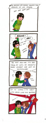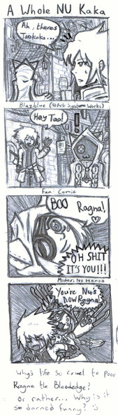 Here is another Blazblue four-panel fan comic. (Currently my fourth!)I finally drew Bang Shishigami! Here we learn about the most basic Ninja Weapon: Silence. (Something ninjas in popular anime seem to know nothing about!