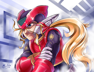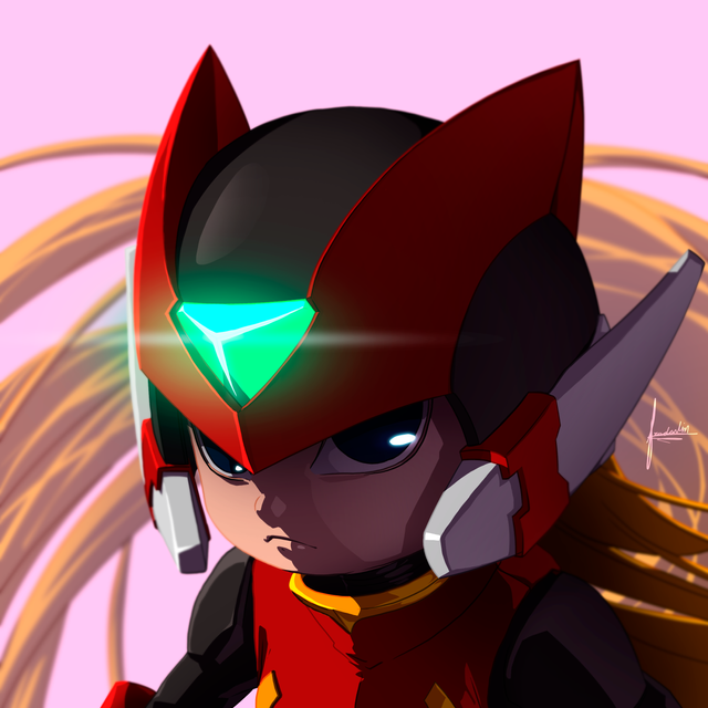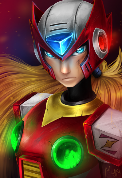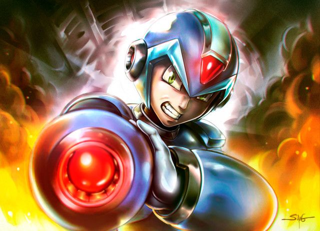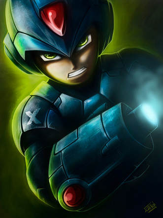 What amazing detail in this artwork; the scuff marks, the chipping and cracks on his helmet and armor...! Down to the thick trickle of blood trailing from the side of his mouth. Looks like he'd just taken down the last Maverick in a horde before facing off against Sigma! (Maybe it's Sigma he could be glaring at, perhaps! Just my imagination, hehe! ^^)