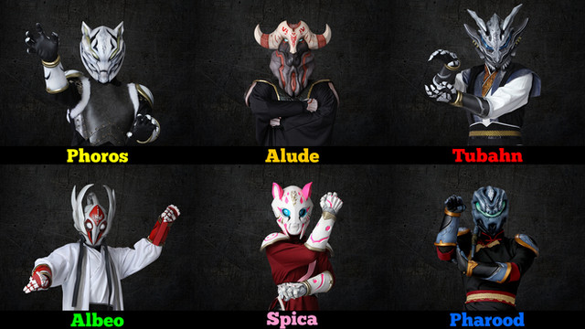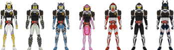 As part of the Great Gegeru, many of Golgom's adherents — those with sufficient zeal and ambition — have been outfitted with "Geister Drivers", designed to imbue them with the power of the monsters that menace Elysium. Ancient Grongi art depicted noted cultural figures with the heads of animals, and so the "Geister Riders" have been provided with Gene Vials using the DNA of the animals found in this art — spiders, snakes, felines, shelled arthropods, and more. The bat of Shadow Moon and the scarab beetle of Black Sun are absent from their ranks, supposedly to ensure no participant would take an "unearned advantage".