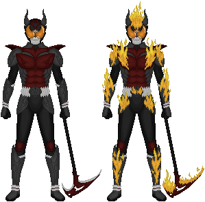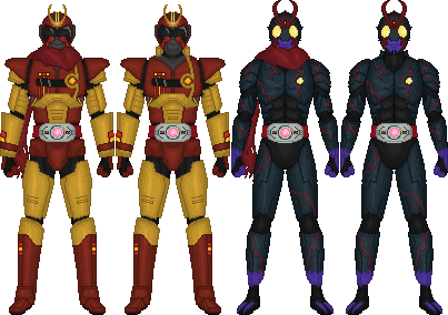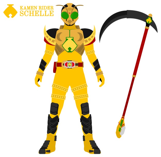 While I didn't design Ringo, he's quite obviously sporting a combined scorpion/cowboy motif, through an "early Heisei" design lens. His faceplate is meant to resemble both a bandanna and a scorpion's mandibles. The minor tweaks I made were adding a crack to his eye-lens and a leg holster for his gun. Per the game master RedlineSSB , his name comes from both Johnny Ringo and the Boktai 2 character Ringo (it has nothing to do with apples); the concept of a character shooting himself in the head to transform, of course, comes from Persona 3's Evokers.