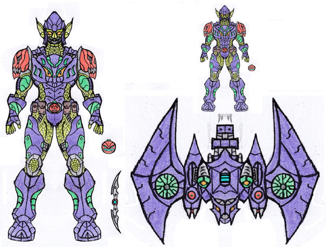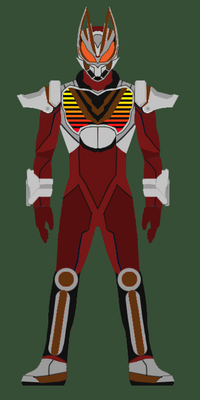 As Senan used the essence of cobra, bat and spider Geisters to engineer his transformation — the "classic three" motifs used by Kamen Rider monsters — he has a cobra-like hood, and a bat-wing shaped head crest and adornments on his armor, patterned with spider webs. Influences that went into his design included Evolt from Kamen Rider Build (in the cobra hood), Benvicktor/Frankenstrike from Ben 10 (in the "stitches"), Rising Ultimate Kuuga (in the armor), and the Way Bads from Ben 10: Omniverse (in general). (There's also single black "pinpricks" in the eyes, in a nod to Ultraseven's goofy-looking suit pupils.) Funnily enough, he ends up looking a lot like a twisted version of Ultraman Nexus, which was completely unintentional.