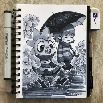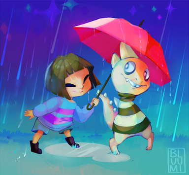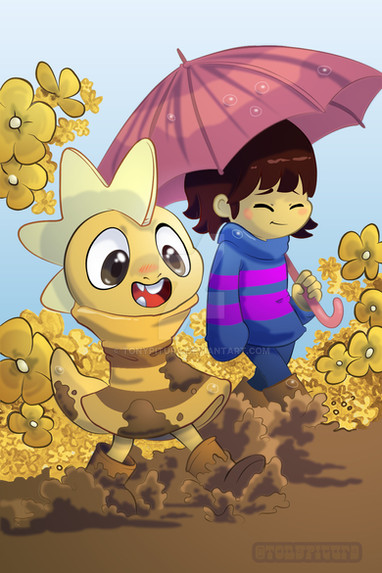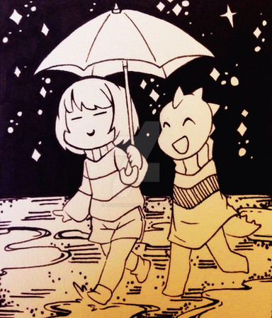 A coloring of Frisk and Monster Kid playing in the puddles after the rain. The original lineart is from tasmaniacdevil, whose art is really good. This is the link to this lineart: www.deviantart.com/art/Splash-…When I saw it I just had to color it cause it's so adorable. I decided to have them playing on the surface, though my background skills are still kind of rough