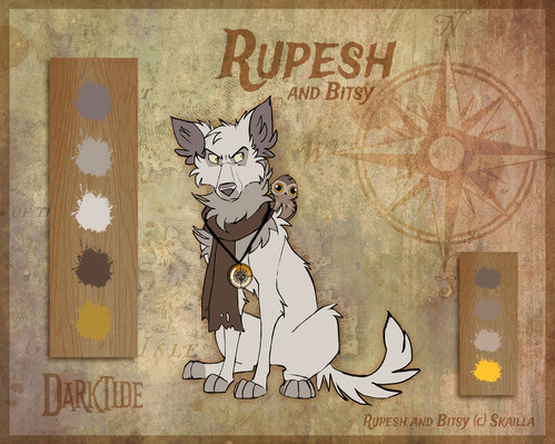 Rupesh is kind of a crazy dog who, after a few (BIG) incidents in his life, decided to become a pirate. Along side with a crew of mutts and airheads, he lives the most exotic and crazy adventures while traveling the whole world through strange seas. Never without with his silent, but loyal little owl, Bitsy (since he couldn't find a proper parrot xD)