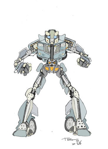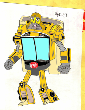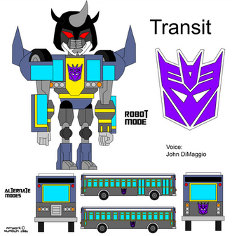 I figure that transit would be a Decepticon, because school buses are just plain evil. His main forms of attack would be picking up kids in bus mode, and then driving around, getting lost, and making them REALLY LATE for school. Then, he could transform into robot mode with them inside and crush them all to death.