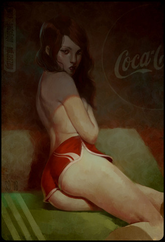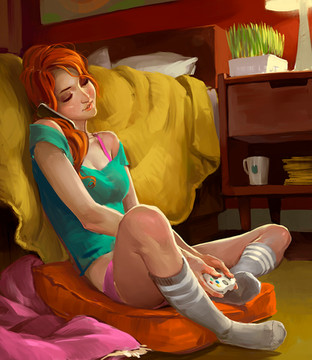 Ya'know I'm more recently really admiringyou're ability to draw poses, there's a great deal of variance. This is a great example as it looks natural but it's not a simple pose, specially at this angle. I love the soft tones of her skin in that light as well. It goes so well with the rich red tones.