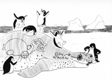 Hahahahahhaha!! Love it. How cute. The seal has such a wonderful perturbed expression. I love the style of the penguins too. Great piece.