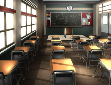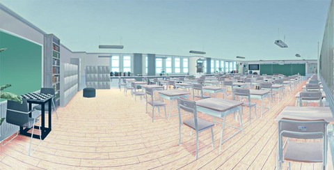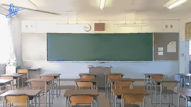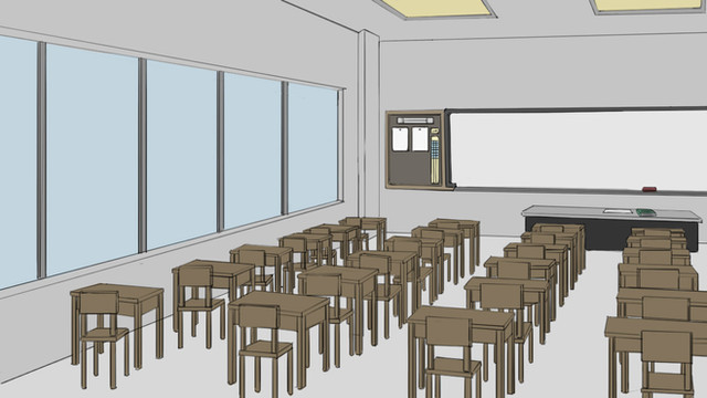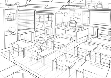 I was falling asleep last night, actually, when it hit me: Gee, if I just draw the horizon line at my eye level, and draw everything to line up to the vanishing point, it should all fall in place. So today when I got back, I sat down with a piece of paper at my work desk and tried it out, and out came this classroom.