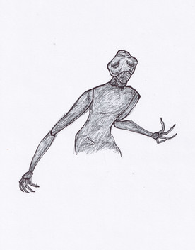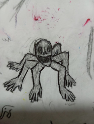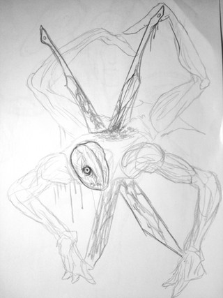 A horrid creature was stretched out in the halls like a spider, it's many arms and legs clinging to the walls as it's lifeless black eyes stared strait at me. It was doll like and it's mouth opened as it breathed hard like it was difficult to even move.