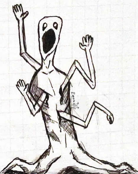 "This was a nightmare I had... the basement really feels like this too (if u read the story)... I'm not the only one who's complained about how it feels unsafe in that house and I really did have to sleep downstairs. Now I live over 2000 miles away & yet I still have nightmares of that place & creatures... I think I'll draw the others too. I genuinely think there's somethings down there..."It was just another normal night... my brothers and sisters went to bed at their usual times and when it was time for me to go to bed I began my usual rounds of turning off the lights and shutting the electronics down. See I sleep in the basement, the cold and incredibly creepy basement where you turn your back to it and you feel like at any second something will snatch you up. It never feels safe, but I've been told it's just my imagination and there's nothing to be afraid of so I suck it up and shut the lights off before going to my room, to my safe and warm bed.