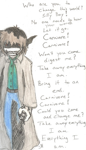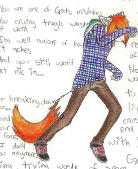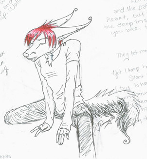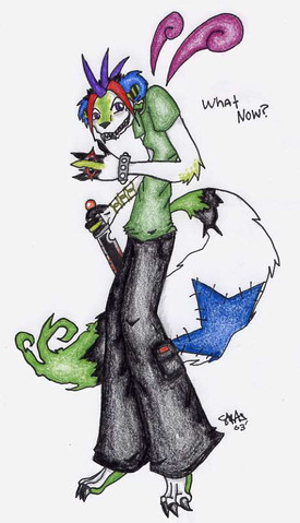 Nuther piccy of Corbin. This looks alot (the face at least) of the Oekaki I did for Chaos; that's cause I was trying to re-do it on paper to figure out what I did wrong that made it look so bad XP *laughs*. Unfortionately, it got all fucked up and ended up looking nothing like Ken, so I just added a body, the ears and some dialogue and voila! It was like a part in your mouth. Or..something. I like the idea of just fixing up the original sketches, though it'd be nice if someday I could hone in some 1337 computer-coloring skillz like Bara-chan or Angie...o.o;;Anyways, this was done because I was in American Studies, and we were looking at steryotypes, and we were doing that game where you look at a picture and write down the first thing that came to your mind. So there was this picture of a sort of techno-goth girl, and some asshole jock named Brian just yelled out "freak!". Just made me want to hit something. Hard. *grumbles* The asshole..