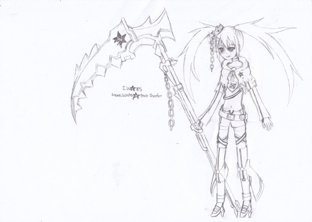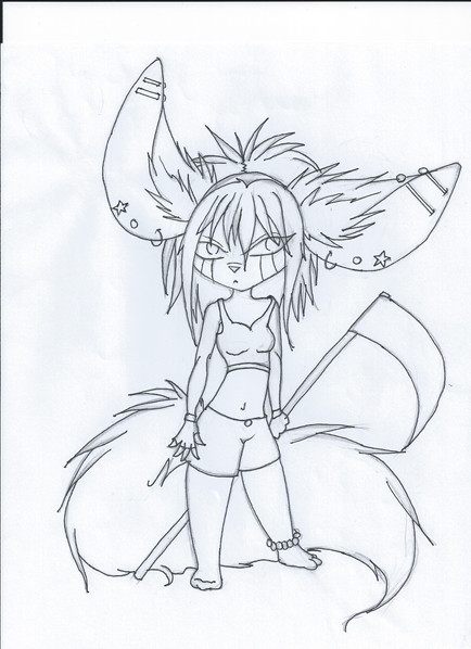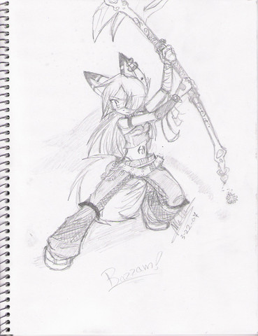 'Nuther sketch (I inked it, but halfway through coloring it I got lazy and..stopped, hehe), done at 1:30 am while watching the discovery channel -- not as much watching as just having it playing in the background.Anyways, I just sketched out the pose real quick (o.O it'll shock you, but I didn't erase much *laugh*), didn't know what to do with her right hand, so I drew a stick, then on TV this weird spined fish-thinggummy came up..and so was born the fish scyth.