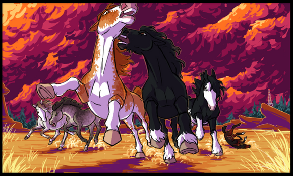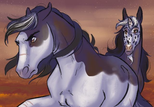 Roamer had unknowingly lead the herd near grazing grounds to a cattle ranch, and now Luna has come across a steer that had gotten free from its fenced in pasture. It seemed to have been equally surprised at Luna for a moment as Luna stared back at them. Another call is heard following from down the hill as the steer looked behind itself. Thundering hooves soon follow as the steer then quickly pushes pass Luna to run for its freedom. Luna Looked down the hill seeing horses running fast toward her, strange beings upon their backs calling out and making whistling sounds. Before she even knew it they were upon her, coming close to trampling her as she scrambled to run. In her panic all she could think of to do is gallop toward Roamer and the others , neighing loudly for her mother. The boisterous commotion finally does get the herd's attention as they start to get up on their hooves. However, it was too little too late with the strange beings now focusing their attention on the herd that has trespassed onto their land. The steer can be caught easily, but pesky mustangs need to be dealt with or chased off. Luna was quick to get lassoed as panic quickly spread through the herd to run. Starlight was the slowest of the bunch and was also quickly roped. She roared out in a furious rage, bucking and rearing to get free. Roamer slides to a halt when he looks back to see Luna and Starlight get captured by the gang of ranchers. He charged back to try and help them as he called to Thunder to keep leading the rest onward.