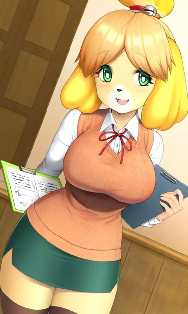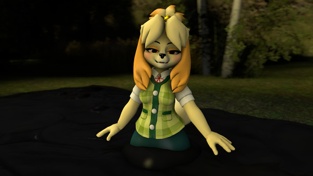 The window blind sunlight beams are a nice pleasant detail. Your take on Isabelle is quite cute, and makes her seem more human. My only critique is hdr arms seem a tad short compared to her torso, and legs. (Nice legs BTW hehe) I like her li'l buckteeth too, and the face is just darling. Very good coloring, and background detail, as well.