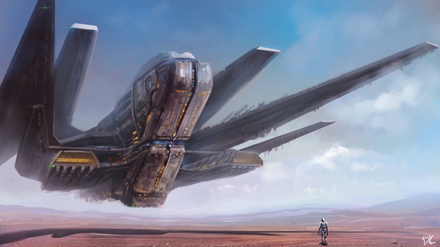 Interesting. I don't know if the planet has a hostile environment or is/was a war zone. The ship isn't all that big; probably a scout craft of some sort. It isn't streamlined, but the folding "wings" suggest it is meant for landings and exploration. Very pleasing picture and thought-provoking as well. Good stuff.