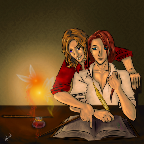 Aaah, c'est trop mignon ! C'est sûr que comme ça, avec lui, tu dois être tout de suite plus motivée.~ Je me demande sur quoi vous planchiez. Tu as ta baguette (foncée !), est-ce que c'était un sortilège ? Et des parchemins, peut-être de l'Histoire de la magie.