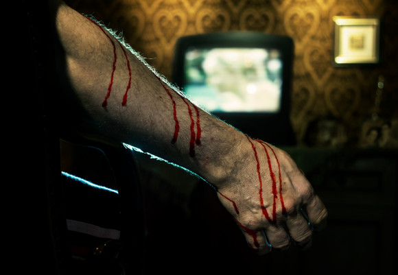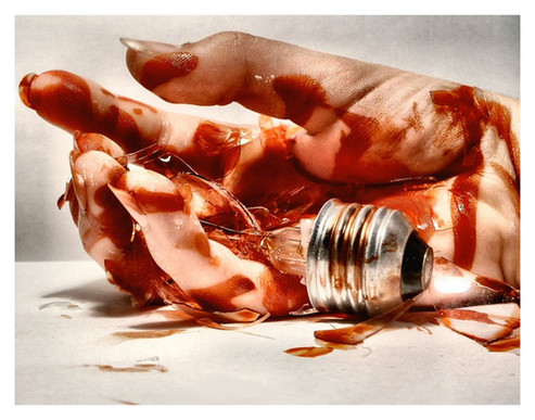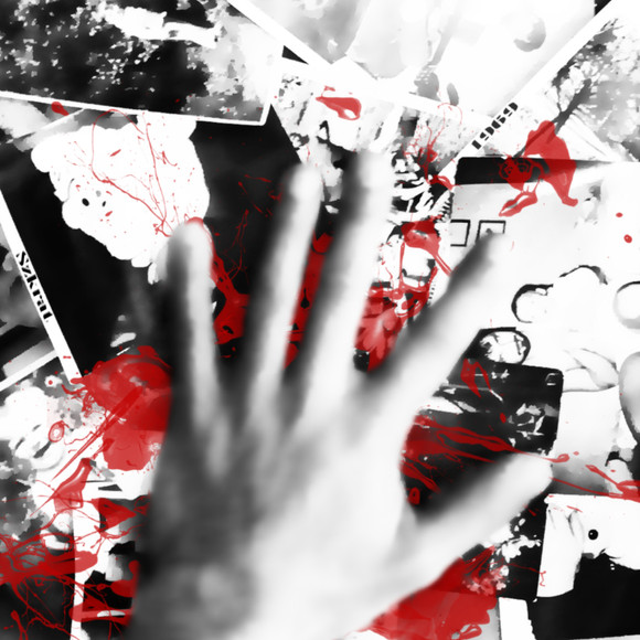 Very interesting work here. Love the intermediate tones. They're not concrete colors, but the contrast they made is very strong and easy to the eyes. That metalic kind of green combined with that plastic orange is a good combination if you want to pass a contemporary feeling. The image broken in different pieces immediately remind me of a mirror broken, or something like what happened into the Matrix... the disintegration of the Agent Smith. Or i'm dreaming too much. The "blood" surely is the symbol of the violence, combined with the hand almost calling for help.