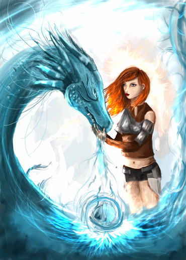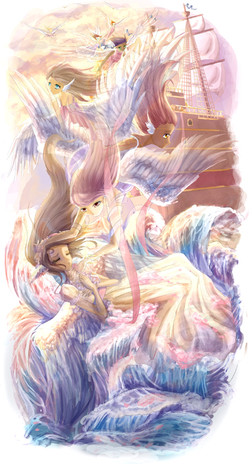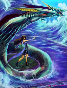 I love the female in the middle of the ocian. You made a good color palette. I wonder if you might not have used Green for her shirt, in stead of blue and white. It does match nicely with te water, but the figure fades more to the background and becomes more with the ocean. But its a choice you've made.