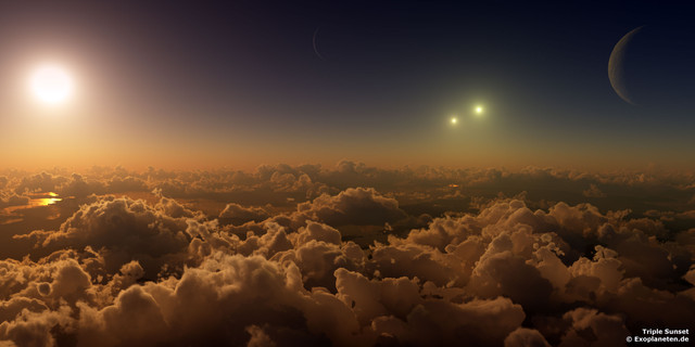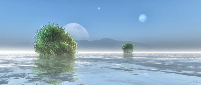 How would look like sunset on alien planet?Most of artists tend to present it as very colorful, almost crayzy scape with various odd things... yet in my opinion it wouldn't be anything unique... it would be one of many sunsets on earth as well, but the numbers of moons (here - 2) and color of liquid filling the seas (could be water with algae, or with some minerals).