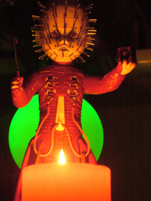 This is a figure of Pinhead (Hellraiser), standing in front of the moonlight.(Added a blue filter)